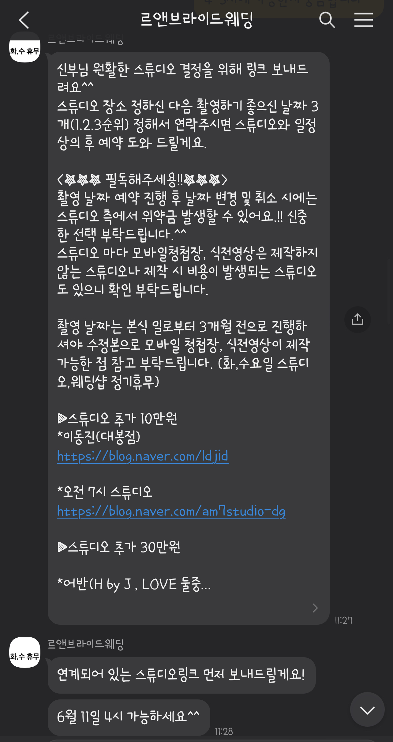 - 본식 도우미 15만원, 스튜디오 촬영 도우미 12~15만원(스튜디오별 상이) 별도 비용 발생