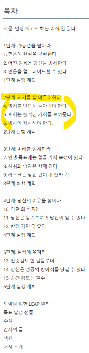 아래는 본 책의 목차이고, 나는 '2단계 과거를 잘 마무리하라' 에서 말하는 단계별로 과거를 제대로 활용하는 방법을 내 삶의 기준으로 바라보려고 한다.