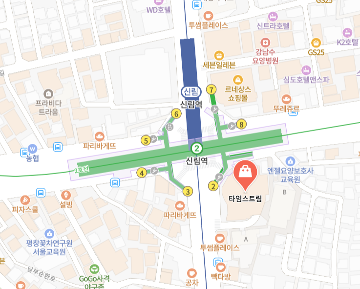 신림역 1-2번 출구 중간에 연결통로가 있어서,