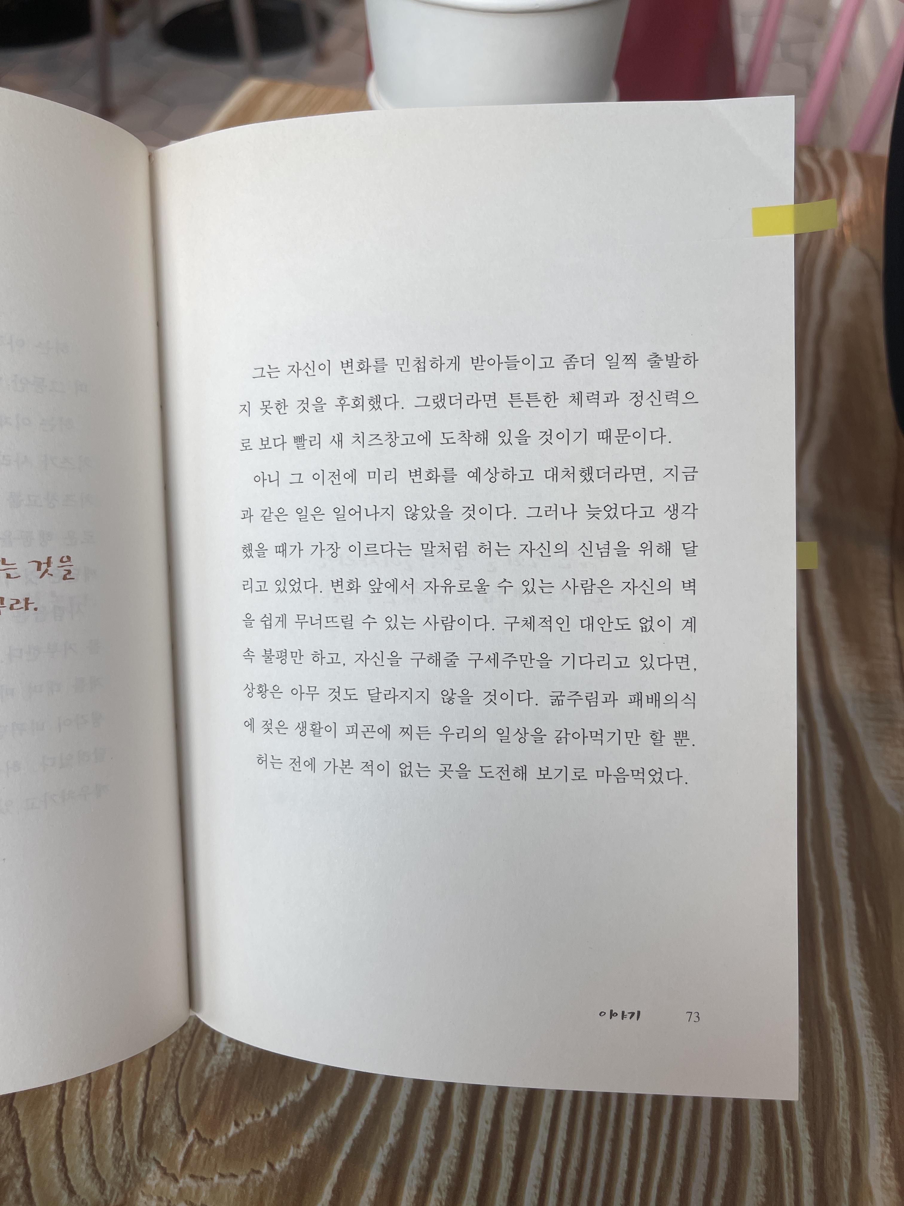 '변화 앞에서 자류로울 수 있는 사람은 자신의 벽을 쉽게 무너뜨릴 수 있는 사람이다.'라는 말이 뼈를 찌른다.