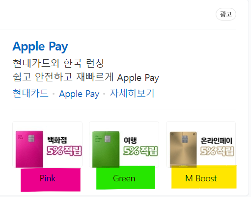 위는 현대카드에서 밀고있는 소비성향에 따른 pink, green, M boost 카드인데 온라인 결제를 많이 하는 나같은 경우에는 M boost나 현대카드 네이버페이 가 끌린다. 네이버페이의 경우 연회비가 1만원으로 저렴한 편이다.